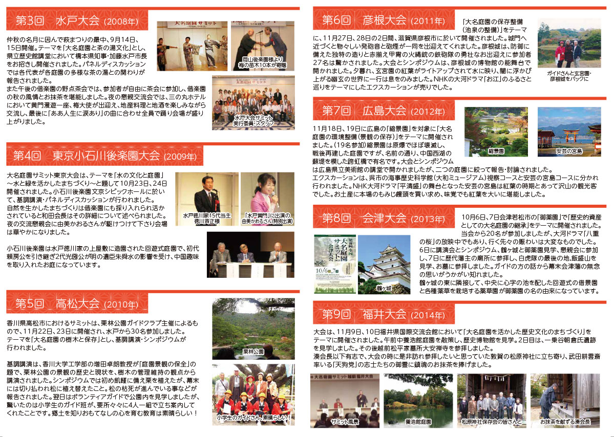 11月開催予定の「大名庭園サミット水戸・東京大会」に向け、会員の参加募集に合わせ、今まで12回各地で開催した大名庭園サミット参加の概要を作成しました。定期広報外の特別号としての記事でしたので、10年間のデータから抜粋し、参加した側の視点でまとめました。